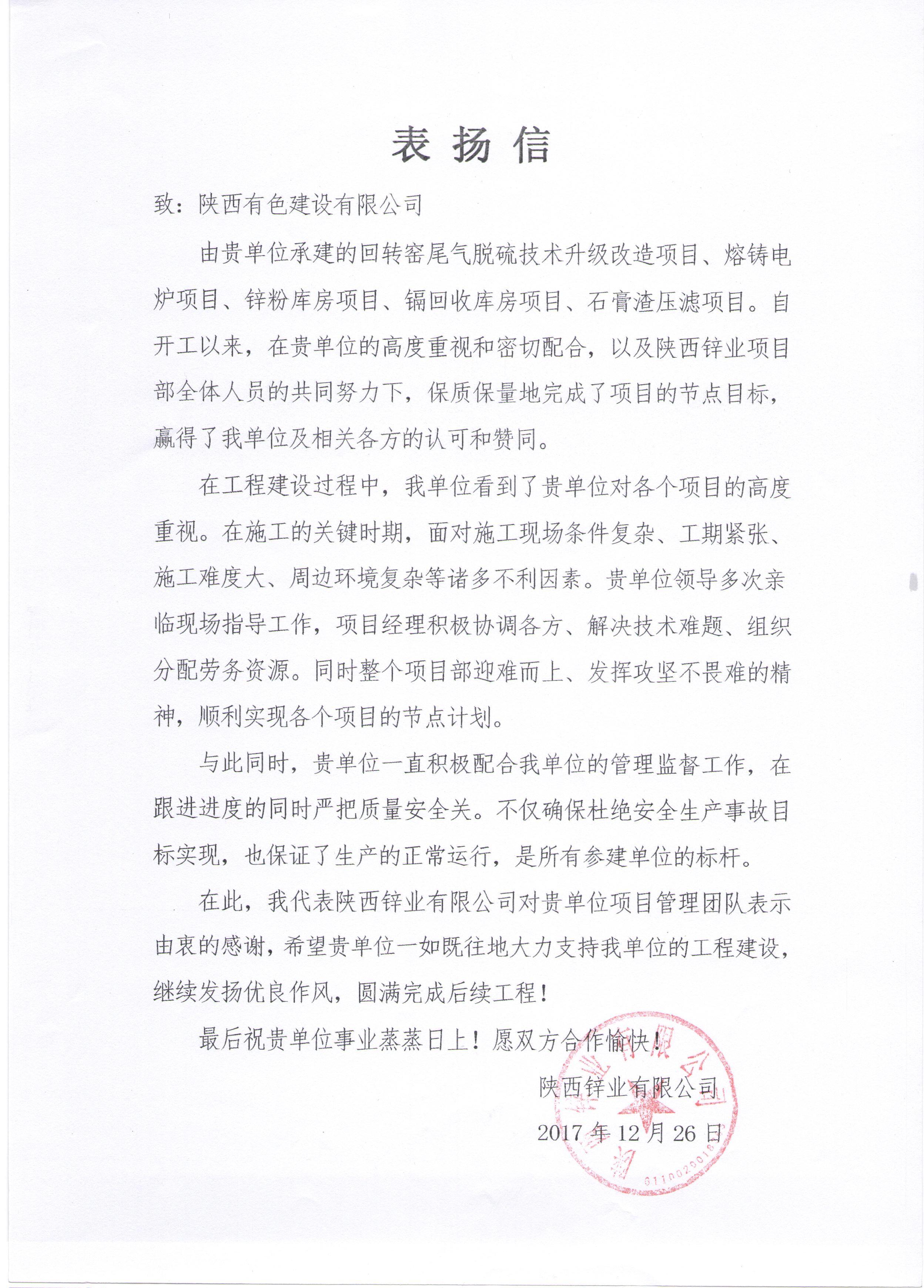 近日,公司收到陜西鋅業(yè)有限公司發(fā)來的表揚(yáng)信,公司陜西鋅業(yè)項(xiàng)目部在回轉(zhuǎn)窯尾氣脫硫技術(shù)升級改造等5個(gè)項(xiàng)目建設(shè)過程中取得的成績表示感謝和高度贊揚(yáng)。