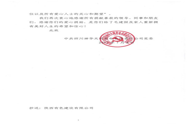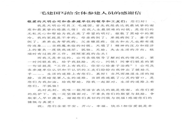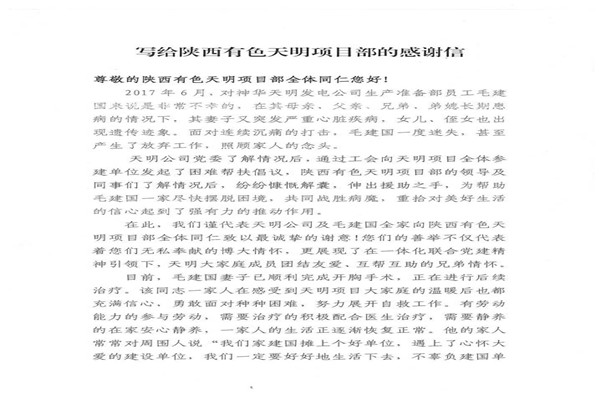 近日,公司神華天明項(xiàng)目部承建的神華四川江油煤炭?jī)?chǔ)備發(fā)電一體化新建工程收到了甲方神華天明發(fā)電公司及其員工毛建國(guó)寄來(lái)的感謝信,對(duì)項(xiàng)目部積極組織愛(ài)心捐款活動(dòng),幫助毛建國(guó)家人一事表示衷心的感謝。